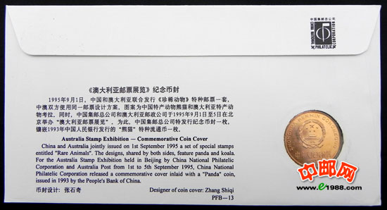 1995年9月1日,中国和澳大利亚联合发行《珍稀动物》特种邮票一套,为此,中国集邮总公司特发行纪念币封一枚,镶嵌1993年中国人民银行发行的“熊猫”特种流通币一枚!