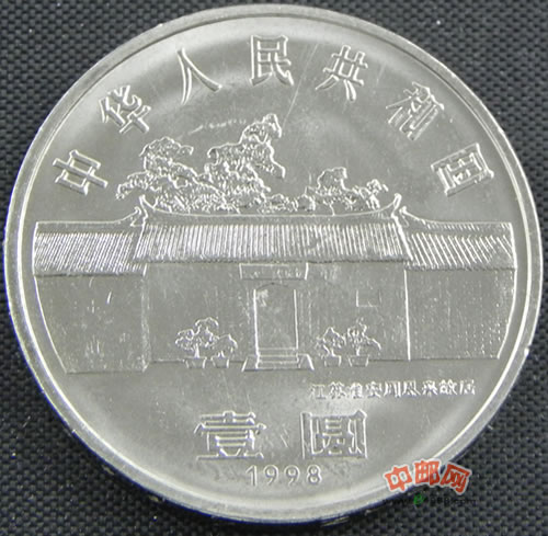 该枚纪念币正面图案为“江苏淮安周恩来故居”院外正门,内缘上方为“中华人民共和国”国名,下方为“壹圆”面值和年号“1998”字样。