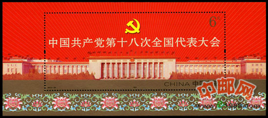 中国邮政今起发行《中国共产党第十八次全国代表大会》纪念邮票,该邮票一套2枚,小型张1枚。邮票图名分别为“科学发展”和“继往开来”,小型张图名为“欢庆”。这套邮票采用多色高网线影写版印刷,选用特种金属油墨,突出画面的金光闪闪和光芒四射效果。该套邮票单张邮票的面值为6元和1.2元两种。