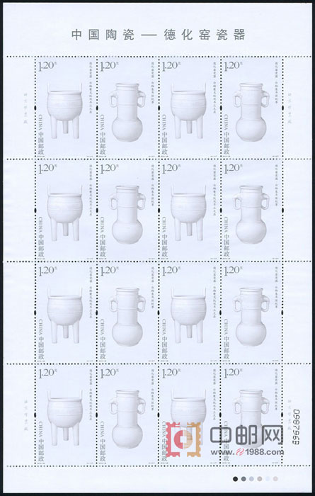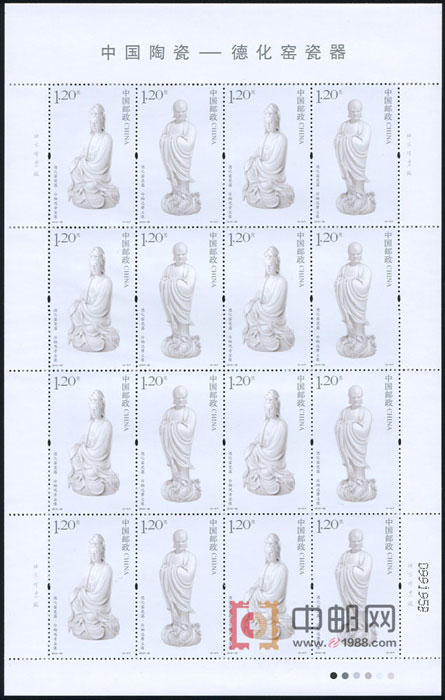 “中国陶瓷—德化窑瓷器”特种邮票一套4枚,内容以明代德化瓷人物和器物为重点,全部采自故宫博物院的藏品,图案分别为:白釉夔龙纹双耳三足鼎、白釉象耳弦纹尊、白釉观音坐像、白釉达摩立像,面值均为1.20元。