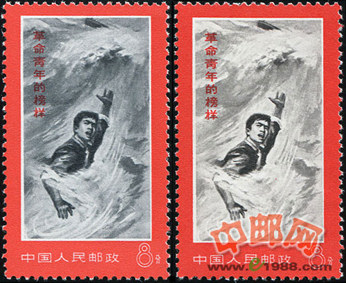 文19 革命青年的榜样--金训华(黑水、白水合售),两枚票的洪水一枚发黑水,一枚发白水,简称黑白水,有一定的收藏价值。