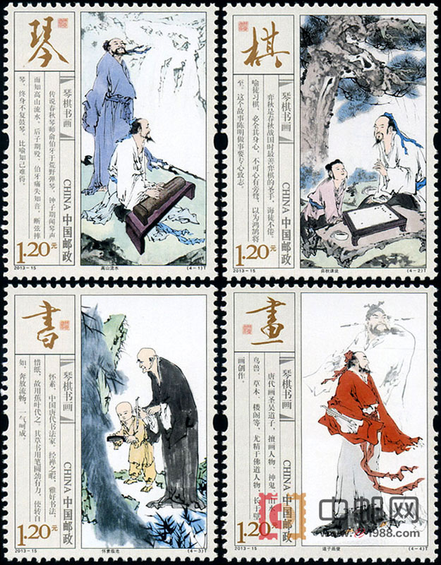 琴棋书画,本指琴瑟、围棋、书法、绘画色彩四种古代艺术性文物或技艺。中国邮政将于2013年7月13日发行《琴棋书画》特种邮票,全套邮票4枚,邮票面值均为1.20元。该套邮票通过历史上画圣吴道子绘八十七神仙卷、俞伯牙与钟子期抚琴、怀素蕉叶练书、弈秋授艺的故事间接的表现了中国传统文化的悠久历史和深刻内涵。更值得一提的是,该套邮票由我国当代著名书画巨匠范曾绘制,想必定会受到邮友们的喜爱。