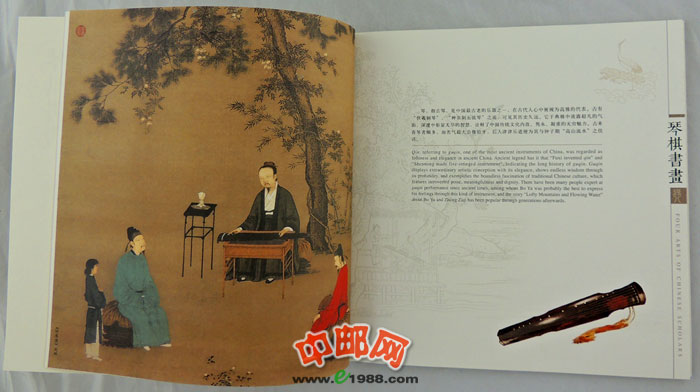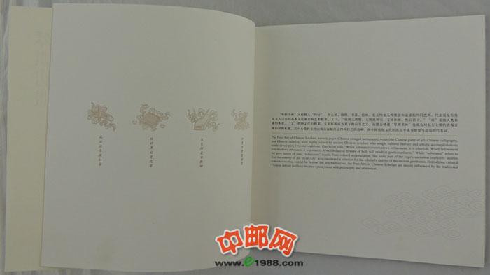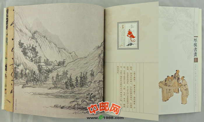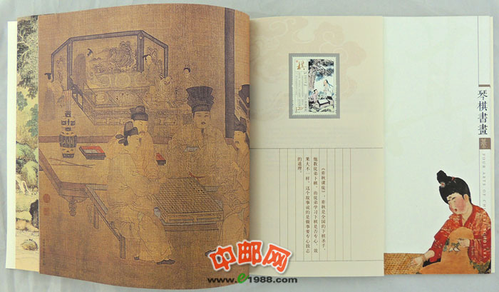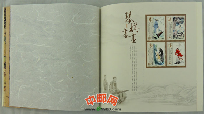 中国邮政将于2013年7月13日发行《琴棋书画》特种邮票,全套邮票4枚,邮票面值均为1.20元。分版式一和版式二(小版)两种,另同时发行《琴棋书画》特种邮票本册1本。这是中国邮政继《中国工农红军长征胜利七十周年》、《外国音乐家》、《中国现代音乐家(一)》、《毛泽东“向雷锋同志学习”题词发表五十周年》之后第五次发行本票册。
