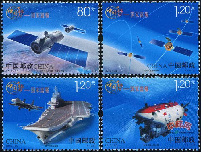 中国邮政定于2013年9月29日增加发行《中国梦(第一组)——国家富强》邮票一套4枚。面值80分1枚,1.2元3枚。内容为神舟飞船与天宫一号交会对接、北斗卫星导航系统、辽宁号航空母舰、蛟龙号载人潜水艇。