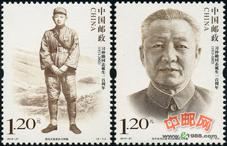 2013年10月15日,习仲勋同志诞生一百周年,中国邮政向全国发行《习仲勋同志诞生一百周年》纪念邮票,邮票为1套2枚,分别命名为:当兵前的习仲勋、任中央书记处书记时期的习仲勋,全套面值2.4元。