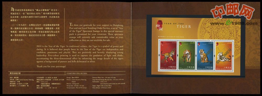 香港2010年虎年小全张样张邮折本