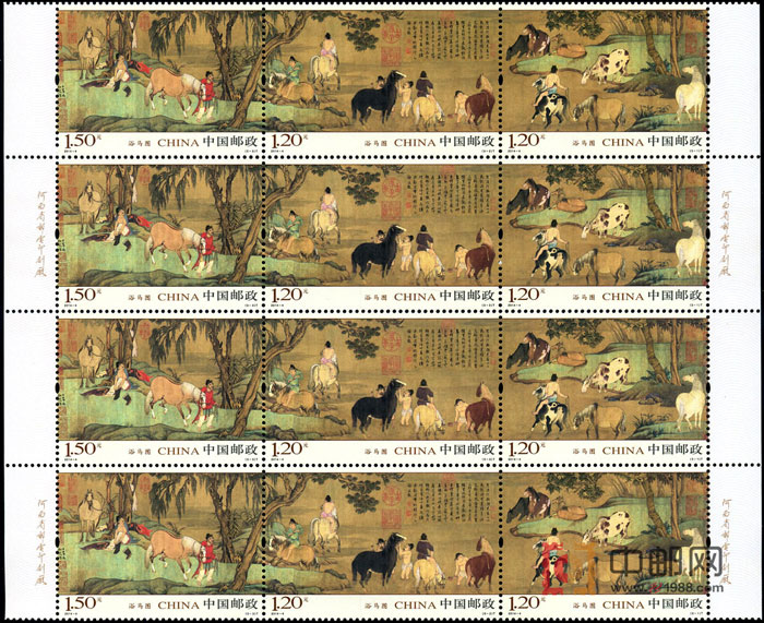 该套邮票采用连票设计形式,并根据画面布局,三枚邮票采用不同的邮票规格。小型张边饰大胆采用暗绿色,含蓄雅致的金色细纹,更好地衬托出画面,整体更显高雅与精湛。邮票印制则以高精度制版方式,多色复合胶版印刷,为最大限度保留原画风格,再现其美轮美奂的风貌。对古画因年代久远造成的损失及缩小后受的影响进行大量的修复与弥补工作,呈现在人们眼前的邮票没有了残缺与斑驳,其线条的精细完整、奚官、马匹神态的自然与有神,树、石、水等都非常精致与柔美。该套邮票由王虎鸣设计,河南省邮电印刷厂印制。