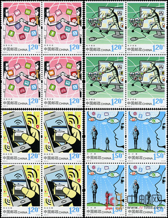 1994年4月20日,中国被国际上正式承认为第77个真正拥有全功能internet(互联网)的国家。中国互联网及衍生物从萌芽逐步走向,是当今信息时代的象征。并与人民生活息息相关,成为生活中密不可分的一部分。网络改变生活,我们的邮票选题更要贴近生活。互联网20年带来的巨变表现在:无处不在的即时新闻,我们只需要敲几下键入不可以了解最新的信息中心通过互联网进行社交、传递信息、购物,等等。这套邮票拟按照互联网发展的四个阶段及当前的应用,表现资讯交流、电子商务、移动互联网、云计算内容。