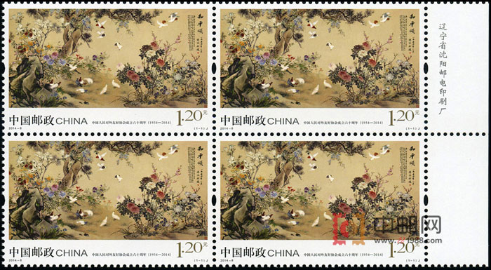 中国邮政定于2014年5月3日发行《中国人民对外友好协会成立六十周年》纪念邮票1套1枚。邮票内容采用了为1955年赫尔辛基世界和平大会而创作并展出的巨幅国画《和平颂》。画面已壮美的松、石和色彩绚丽的百花以及飞翔穿插的鸽子组成,使人们感受到一派欣欣向荣的和平景象。此画由齐白石、陈半丁等14位画家集体创作并由郭沫若先生题款,采用中国传统的工笔双钩填色,没骨点染以及小写意的手法表现,现收藏在全国友协。