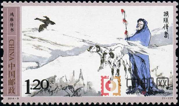 《鸿雁传书》邮票以千古流传的“苏武牧羊”故事作为画面表现内容。邮票特约我国著名艺术家范曾先生专题创作,作者用苍劲的笔力描绘了西北苦寒之地的苍茫飘渺,伫立于边疆的苏武回望故乡充满了忧思和苦楚。该套邮票采用雕刻版印刷,雕刻线条加强了人物与背景之间的对比,使得艺术冲突更为强烈,人物性格更为鲜明。该套邮票由北京邮票厂印制。