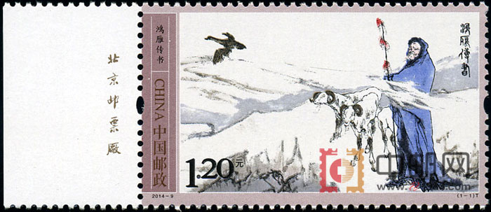 《鸿雁传书》邮票以千古流传的“苏武牧羊”故事作为画面表现内容。邮票特约我国著名艺术家范曾先生专题创作,作者用苍劲的笔力描绘了西北苦寒之地的苍茫飘渺,伫立于边疆的苏武回望故乡充满了忧思和苦楚。该套邮票采用雕刻版印刷,雕刻线条加强了人物与背景之间的对比,使得艺术冲突更为强烈,人物性格更为鲜明。该套邮票由北京邮票厂印制。