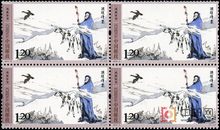 《鸿雁传书》邮票以千古流传的“苏武牧羊”故事作为画面表现内容。邮票特约我国著名艺术家范曾先生专题创作,作者用苍劲的笔力描绘了西北苦寒之地的苍茫飘渺,伫立于边疆的苏武回望故乡充满了忧思和苦楚。该套邮票采用雕刻版印刷,雕刻线条加强了人物与背景之间的对比,使得艺术冲突更为强烈,人物性格更为鲜明。该套邮票由北京邮票厂印制。