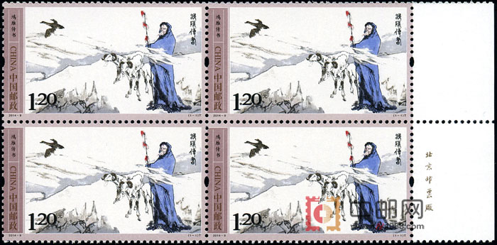 《鸿雁传书》邮票以千古流传的“苏武牧羊”故事作为画面表现内容。邮票特约我国著名艺术家范曾先生专题创作,作者用苍劲的笔力描绘了西北苦寒之地的苍茫飘渺,伫立于边疆的苏武回望故乡充满了忧思和苦楚。该套邮票采用雕刻版印刷,雕刻线条加强了人物与背景之间的对比,使得艺术冲突更为强烈,人物性格更为鲜明。该套邮票由北京邮票厂印制。