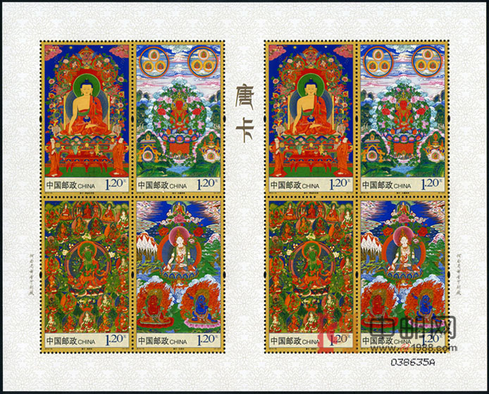 这套邮票设计上借鉴了中国画竖式卷轴装裱形式,其规格也为近年少见的超大规格,经过精细的修饰和多色复合胶印印刷,画面厚重,色彩浓烈,再现了唐卡之特点及精美细节,边饰采用金色和唐卡惯用花纹纹样,更增添了整套邮票金彩辉映的奇丽意境和独特性。