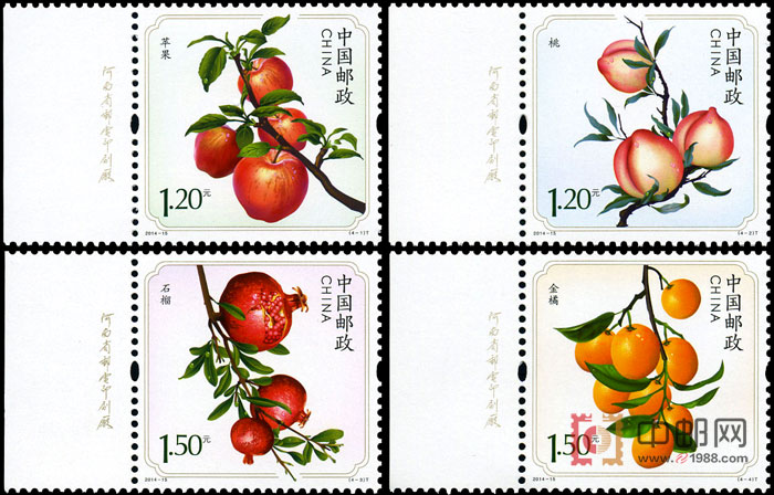 中国邮政定于7月15日发行《水果(一)》特种邮票一套4枚,全套面值5.4元,邮票规格33毫米×33毫米,每版20枚,整版规格200毫米×170毫米。同时有版式二,整版两套,每版售价10.8元,规格190毫米×110毫米。设计者李志宏,由河南省邮电印刷厂印制。邮票内容是苹果、桃、石榴、和金橘。
