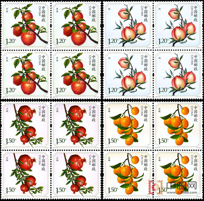 这组邮票选用的是深受大众喜爱、寓意好的水果。苹果的寓意是平平安安、金橘象征福寿吉祥、桃意指福与寿 、石榴寓意多子多福,家族兴旺。4枚邮票分别表达了平平安安、金玉满堂、益寿延年、多子多福等美好寓意。