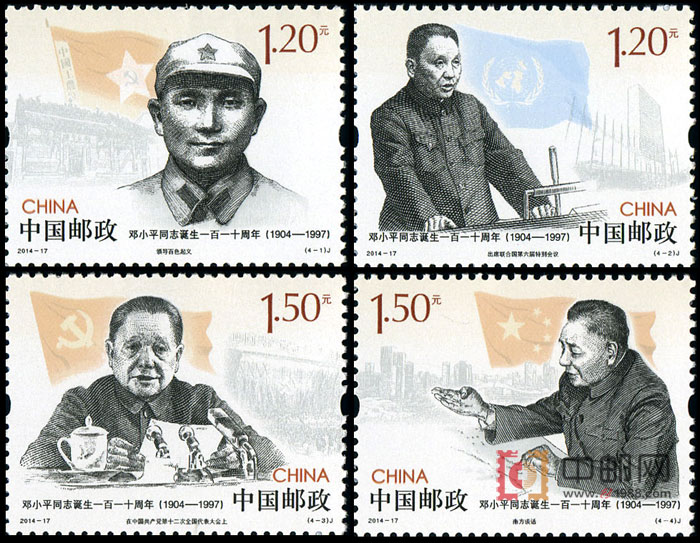 中国邮政定于2014年8月22日增加发行《邓小平同志诞生110周年》纪念邮票一套4枚、小版张一套。邮票内容分别为:领导百色起义时期的邓小平、出席联合国第六届特别会议的邓小平、在中国共产党第十二次全国代表大会上、南方谈话。发行版式二小版张,内含2套8枚。第一枚“白色起义”,以红七军军部旧址粤东会馆为背景,表现当时邓小平的形象。第二枚 “出席联合国第六届特别会议”,以联合国国旗和总部大楼为背景,还原了当时邓小平在大会上讲话的场景。第三枚以党旗和人民大会堂为背景,描绘了邓小平在大会上讲话的场景。第四枚以国旗和经济特区风貌为背景,展示了邓小平同志南方谈话的场景。