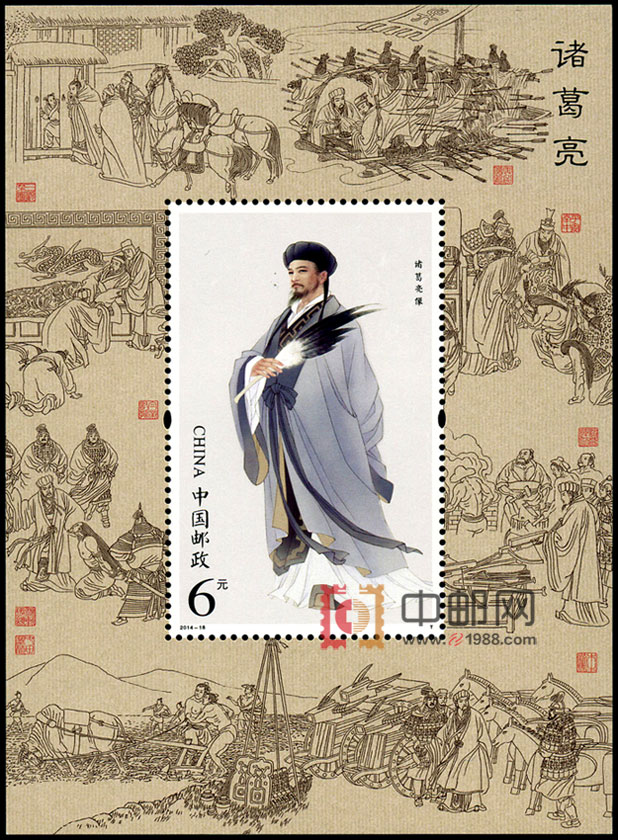 8月28发行《诸葛亮》特种邮票一套2枚,小型张1枚,小版张一套。发行版式二小版张一套,版式三大本册一套。第一枚邮票是刘备三顾茅庐,与诸葛亮分析天下形势,后人称此场景为“草庐对”或“隆中对”。 第二枚描述晚年诸葛亮创作《出师表》的场景。小型张是诸葛亮半侧面立像,背景搭配三顾茅庐、草船借箭、平定南中、诸葛连弩、木牛流马、屯田垦殖、泪斩马谡、白帝托孤等八个诸葛亮的典型故事和主要功绩。