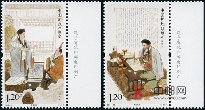 8月28发行《诸葛亮》特种邮票一套2枚,小型张1枚,小版张一套。发行版式二小版张一套,版式三大本册一套。第一枚邮票是刘备三顾茅庐,与诸葛亮分析天下形势,后人称此场景为“草庐对”或“隆中对”。 第二枚描述晚年诸葛亮创作《出师表》的场景。小型张是诸葛亮半侧面立像,背景搭配三顾茅庐、草船借箭、平定南中、诸葛连弩、木牛流马、屯田垦殖、泪斩马谡、白帝托孤等八个诸葛亮的典型故事和主要功绩。
