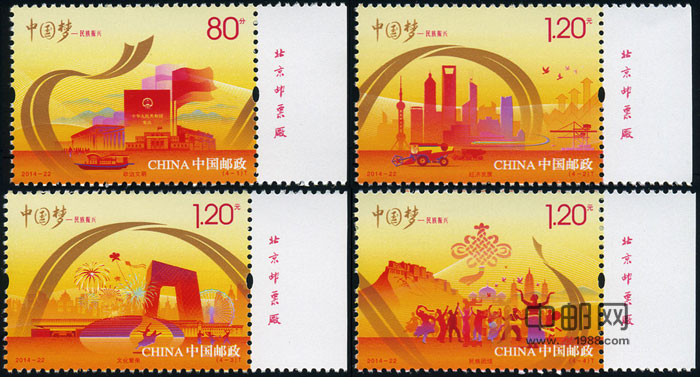 中国邮政定于2014年9月20日发行《中国梦—民族振兴》特种邮票一套4枚,全套面值4.40元,另发行小全张一枚,售价6.60元。