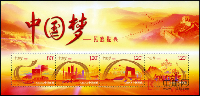 中国邮政定于2014年9月20日发行《中国梦—民族振兴》特种邮票一套4枚,全套面值4.40元,另发行小全张一枚,售价6.60元。