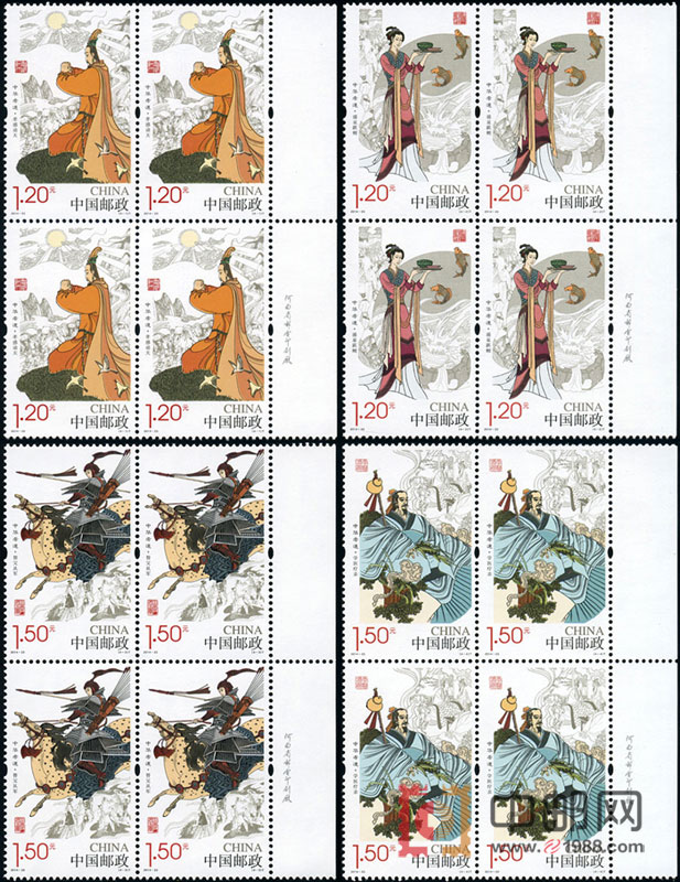 该套邮票还特别约请了李岚清同志根据图名称创作印章。四方篆印各有章法,富于变化,特别是“替父从军”印章采用阴阳相结合的刻法,使篆刻与邮票内容——女代父从军形成内在的关联。该套邮票由河南省邮电印刷厂采用胶雕套印工艺印制。