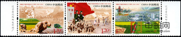 2014年10月7日,新疆生产建设兵团成立六十周年,当天中国邮政集团公司为纪念这一历史事件将发行纪念邮票一套三枚。内容分别为:艰苦创业、安定团结、辉煌成就,表现了新疆生产建设兵团六十年来屯垦戍边、保卫祖国、建设边疆的伟大历史贡献。