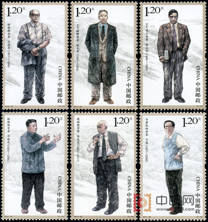 2014年是中国原子弹成功爆炸五十周年,为配合中国原子弹成功爆炸五十周年纪念活动,中国邮政定于10月16日发行2014-25《中国现代科学家(六)》纪念邮票一套六枚,拟表现表现核物理学家王淦昌、核物理学家邓稼先、核物理学家朱光亚、空气动力学家郭永怀、大气物理学家赵九章、计算机技术专家王选六位现代科学家。