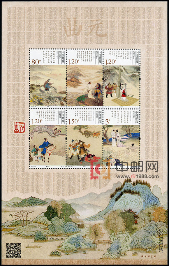 中国邮政定于2014年12月1日发行《元曲》特种邮票一套六枚,拟分别表现元杂剧《窦娥冤》(关汉卿)、元杂剧《赵氏孤儿》(纪君祥)、元杂剧《倩女离魂》(郑光祖)、元杂剧《墙头马上》(白朴)、元散曲《山坡羊•潼关怀古》(张养浩)、元散曲《天净沙•秋思》(马致远)。画面设计使用古版画,还原元曲的本质。