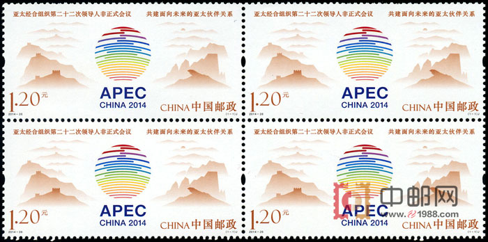 邮票以APEC标志为中心,两边以简约手法展现了我国的壮美山河,APEC标志犹如东升的旭日被群山环绕,寓意着亚太经济合作的光明前景。票面上方表现的的是此次的峰会的主题:共建面向未来的亚太伙伴关系。