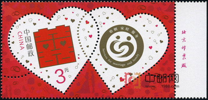 商品详情:中国邮政定于2014年12月1日发行《婚禧》个性化服务专用邮票1套1枚,邮票为心形异形邮票,同时发行附票带有婚姻家庭服务图案的个性化服务专用邮票。
