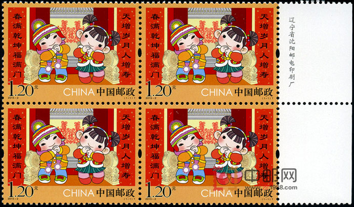 中国邮政将于2015年1月10日发行《拜年》特种邮票一套一枚,面值1.2元。同时发行版式二(含8枚邮票),该套邮票邮吴冠英老师设计,2015年的羊年生肖邮票也出自吴冠英老师之手。