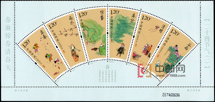 全套6枚邮票采用相同的扇形规格连印,每枚票下有相关节气太阳在黄道上的度数。连票四周有完整的边纸,右边纸印有邮票名称“《二十四节气(一)》”,左边纸印有“春雨惊春清谷天”,下边纸印有《二十四节气歌》中关于“春”的这6个节气的语句:“西园梅放立春先 云镇霄光雨水连 惊蛰初交河跃鲤 春分蝴蝶梦花间 清明时放风筝好 谷雨西厢宜养蚕”。全张票由两套邮票上下相接,形成精美别致的小版票。