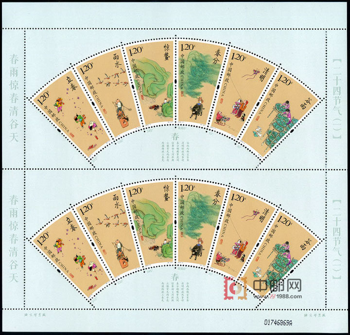 全套6枚邮票采用相同的扇形规格连印,每枚票下有相关节气太阳在黄道上的度数。连票四周有完整的边纸,右边纸印有邮票名称“《二十四节气(一)》”,左边纸印有“春雨惊春清谷天”,下边纸印有《二十四节气歌》中关于“春”的这6个节气的语句:“西园梅放立春先 云镇霄光雨水连 惊蛰初交河跃鲤 春分蝴蝶梦花间 清明时放风筝好 谷雨西厢宜养蚕”。全张票由两套邮票上下相接,形成精美别致的小版票。