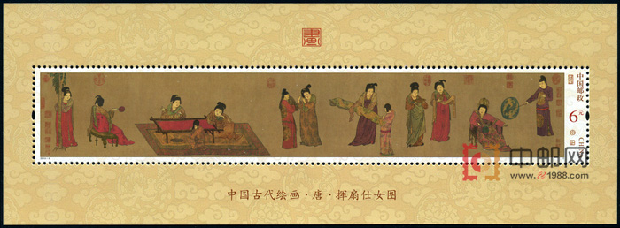 中国邮政计划将于2015年3月22日发行《挥扇仕女图》特种邮票一套3枚,小型张1枚。原画是一幅描写唐代宫廷妇女生活的佳作。全郑所画人物共计十三人,分为五个自然段落。引首清高宗经历题“猗兰清画”四字。画作长卷。