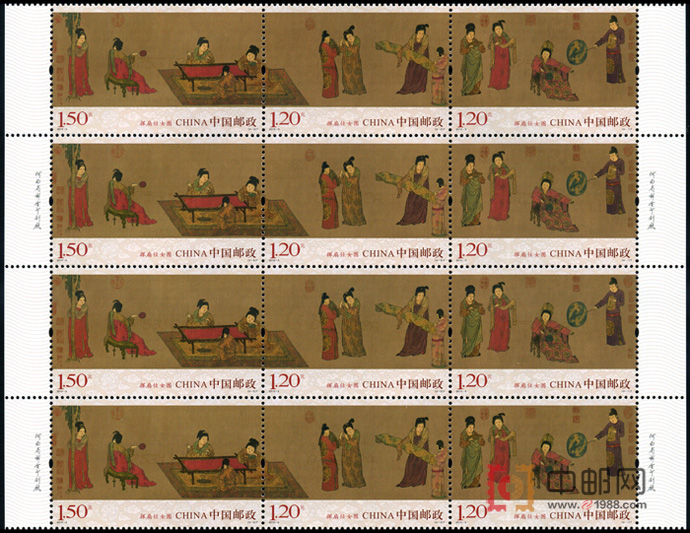 中国邮政计划将于2015年3月22日发行《挥扇仕女图》特种邮票一套3枚,小型张1枚。原画是一幅描写唐代宫廷妇女生活的佳作。全郑所画人物共计十三人,分为五个自然段落。引首清高宗经历题“猗兰清画”四字。画作长卷。