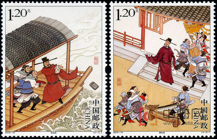 中国邮政定于2015年8月8日发行《包公》特种邮票1套2枚,小型张1枚,邮票内容分别为掷端砚、铡美案,小型张内容为包公像。全套邮票面值为8.40元。