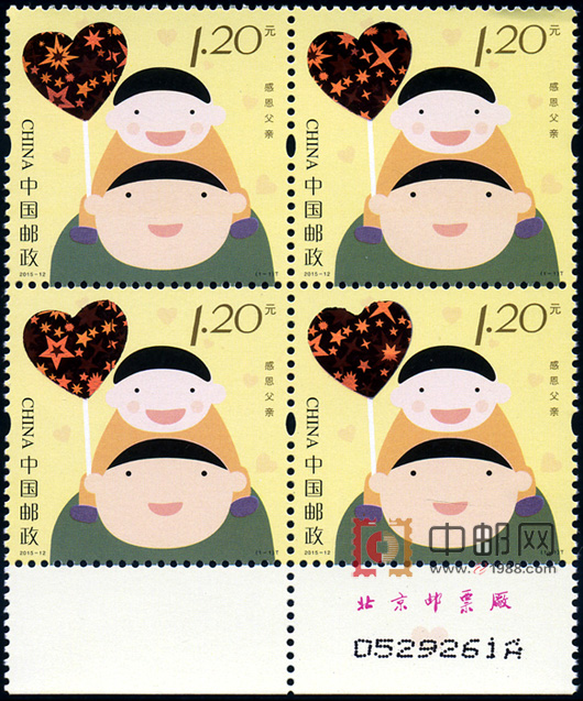 此套邮票是中国邮政发行的刮出祝福邮票,刮开邮票内粉色气球的覆盖层,可显出感恩父亲的祝福语。祝福语共四条,分别为“爸爸,我爱您”、“父爱如山”、“祝爸爸平安幸福”、“爸爸,您辛苦了”。每枚邮票印制一条祝福语,每条祝福语在邮票“版式一”中各出现4次,在邮票“版式二”中各出现2次。