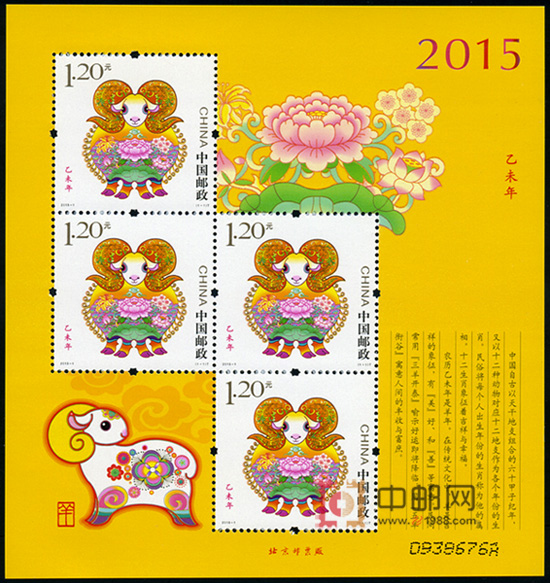 《乙未年》生肖羊邮票以绵羊作为造型的基础,绵羊身体丰满,可爱,雄羊有螺旋状的大角。羊角以缠枝花草纹样为装饰,象征福气延绵不绝,长长久久。羊的身上为牡丹、莲花等人们喜闻乐见的花卉,寓意四季平安、富贵有余,是民俗常用的节庆装饰;花边伴以祥云、水波纹等吉祥纹样,水动则财来,水和云以流动的形象使整个画面动静结合。整个画面象征了吉祥、圆满、幸福绵长的寓意。