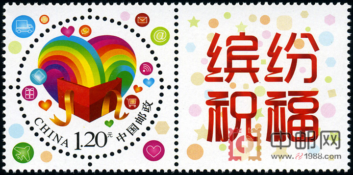 中国邮政定于2015年6月18日发行《缤纷祝福》个性化服务专用邮票1套1枚,同时发行附票带有“缤纷祝福”字样及图案