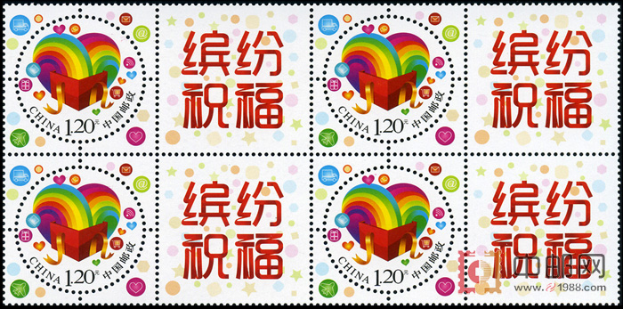 商品详情:中国邮政定于2015年6月18日发行《缤纷祝福》个性化服务专用邮票1套1枚,同时发行附票带有“缤纷祝福”字样及图案