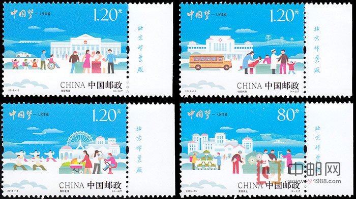 中国邮政定于2015年7月25日发行《中国梦—人民幸福》特种邮票1套4枚,小全张1枚,邮票内容分别为:安居乐业、社会保障、社会和谐、美好生活。全套邮票面值为4.40元,小全张售价为6.60元。北京邮票厂影写版印制。