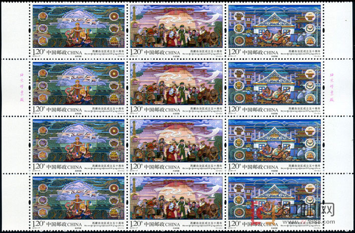 中国邮政定于2015年9月1日发行《西藏自治区成立五十周年》纪念邮票1套3枚。邮票内容分别为:美丽西藏、和谐西藏、幸福西藏。全套邮票面值为3.60元。