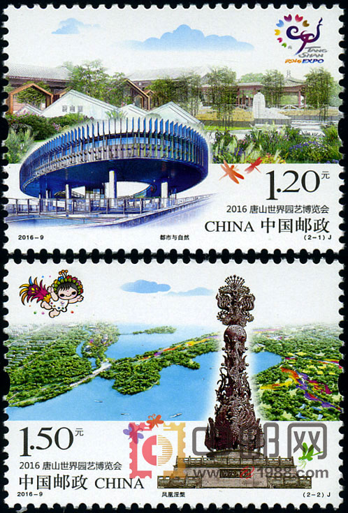 中国邮政定于2016年4月29日发行《2016唐山世界园艺博览会》纪念邮票1套2枚,图案内容分别为都市与自然、凤凰涅槃,全套邮票面值为2.70元。