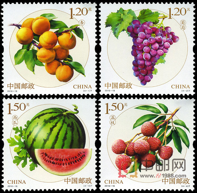 2016年7月23日,国家邮政将要发行水果(二)邮票一套四枚。这次发行的水果邮票是葡萄、荔枝、杏和西瓜。葡萄寓意多子,荔枝寓意大利,杏寓意幸福、兴旺发达、幸运,西瓜寓意大红大紫。