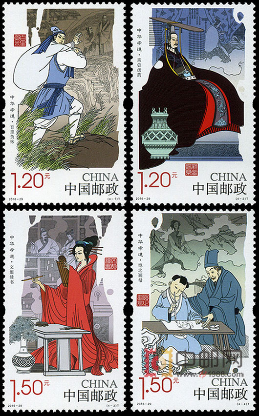 - 商品详情:中国邮政已于2014年9月30日发行《中华孝道(一)》特种邮票1套4枚,由此拉开该系列邮票的序幕,据推测,该 系列邮票将发行六组(每组4枚)完全展现中国传统的“二十四孝”故事。