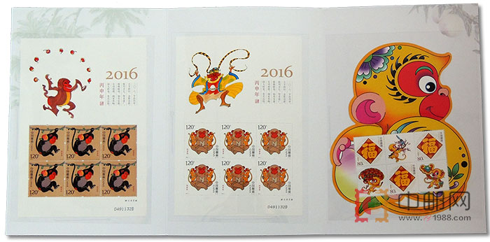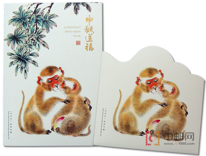 生肖传统产品,小巧精致。封面“猴”的造型活泼灵动,贴近《丙申年》邮票特点。三折邮折,带封套。产品内含《丙申年》小版、三枚版异形个性化邮票。