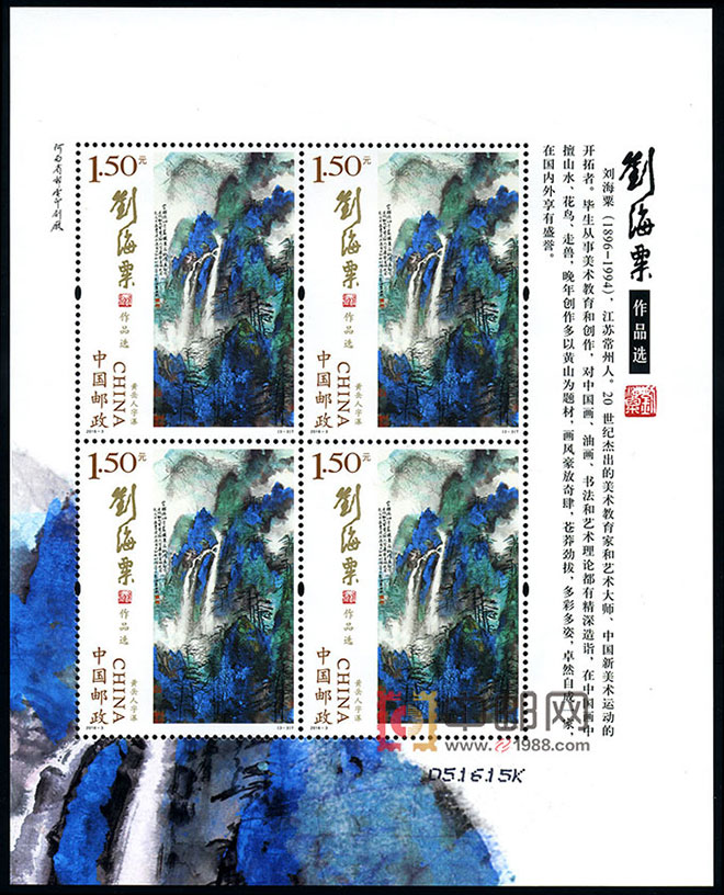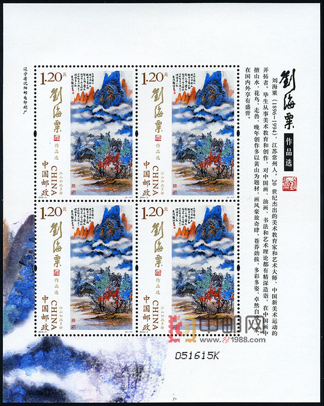 刘刘海粟先生诞生于1896年3月16日,到今年的3月16日是刘海粟先生120周年诞辰日。中国邮政选在这样的时日发行《刘海粟作品选》,也是献给刘老120岁的生日大礼。名家作品选属特种邮票,特种邮票在生日之际首发,寓意深刻,用心良苦。更巧合的是,发行之日,2016年全国“两会”隆重召开,胜利闭幕。全套邮票选用的第一枚“江山如此多娇”是否对祖国大好河山的赞美,对美丽中国的良好祝愿,