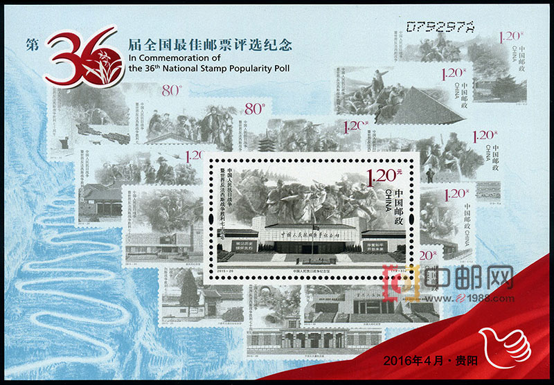 4月23号,第36届全国最佳邮票评选颁奖大会在贵阳举行,《中国人民抗日战争暨世界反法西斯战争胜利七十周年》纪念邮票荣获最佳邮票奖。