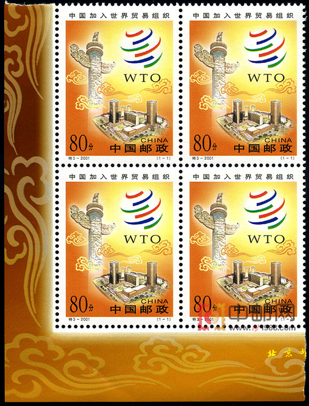 2001-特3 中国加入世界贸易组织(半厂铭四方连)